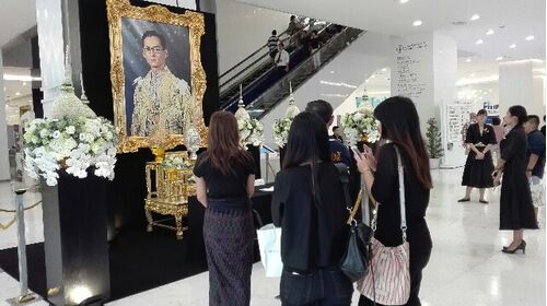 バンコク市内は、今日も悲しみが広がっている。エムクオーティエの入り口には、国王の記帳台がもうけられ、長い列ができていた。 街を歩く人々はほとんどが黒い服。 デパートのディスプレイやお店の中も、黒い服や靴、鞄だらけだった。ユニクロのディスプレ…