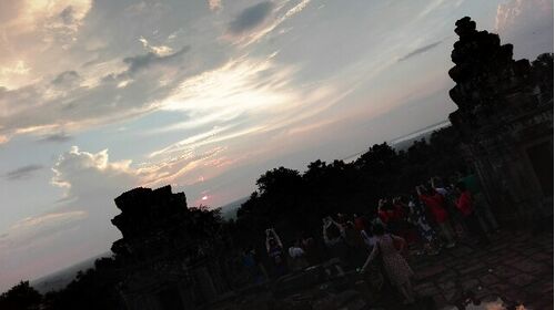 1日目、2日目は天気が悪く見られなかった夕日、最後のチャンスと思いプノン・バケンへ。 こちらは小高い山の上にある遺跡で、シェムリアップでは一番キレイに見えるスポット。 でも、入場制限があり(300人まで)、ガイドブックにはガイド同伴が条件(実際ガ…